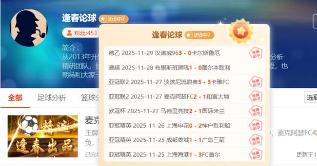 逢春论球本名朱逢春,早年担任足球解说员,从2013年正式入职足球分析师-对亚欧数据的变化套路了如指掌。2018年俄罗斯世界杯更是2次拿下任14(一奖),2023年欧洲杯拿下23连红的傲人战绩。抓冷门技术更是一把好手,最近两年更是凭借一手独家的四维彩超数据分析将胜率再拔新高。