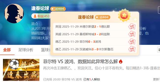 逢春论球本名朱逢春,早年担任足球解说员,从2013年正式入职足球分析师-对亚欧数据的变化套路了如指掌。2018年俄罗斯世界杯更是2次拿下任14(一奖),2023年欧洲杯拿下23连红的傲人战绩。抓冷门技术更是一把好手,最近两年更是凭借一手独家的四维彩超数据分析将胜率再拔新高。