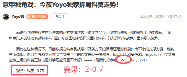 【上期回顾】:昨天私推暂停,而前天超级重点意甲方案科莫彩蛋再次击出,连胜脚步再次开启!——今天核心赛事已确认,信心依旧,各位可点击一下【赞赏】按钮给予鼓励,轻松在“站内信”获取当天新鲜信心专场哦!多一份参考离喜悦再近一步,Yoyo将继续率粉粉们继续前行~