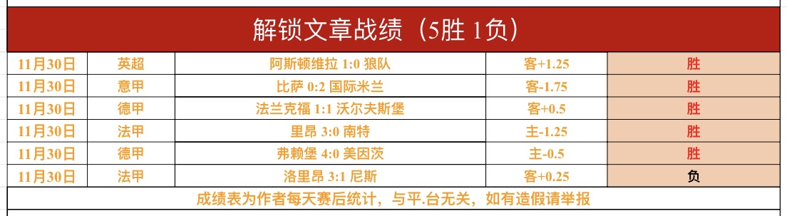 战绩回顾:昨日总计7战拿到6胜1负,成绩很出色!解锁文章6战拿到5胜1负,成绩很出色!数据深浅判断完美全正确!英超狼队、意甲国际米兰、德甲沃尔夫斯堡、弗赖堡、法甲里昂完美全胜!法甲尼斯没有打出!总进球数1场,荷甲前进之鹰大方向完美全胜,总进球数近10胜7,成绩出色!鸡锅不追求场次多,追求少而精准,绝不滥竽充数,必须把老铁们的每一份信任都转化为胜利!