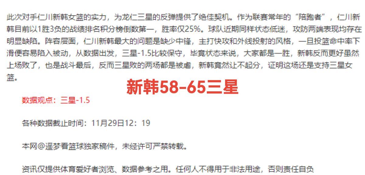 三星 4 轮联赛,取得 2 胜 2 负的战绩,球队场均得分 63.2 分,场均失分 65 分,进攻端火力相较于联赛前两名稍显不足,防守端也存在一定漏洞,这也是其主场接连失利的重要原因之一。这个赛季球队面临不小的人员调整挑战,得分核心外援吉安娜?斯密斯离队,对球队进攻端影响显著。内线方面,36 岁的老将裴慧润让出首发位置,新秀川村美雪获得首发机会,效果不好,内线篮板保护能力有待加强。不过球队仍坐拥李海兰、姜宥琳等韩国女篮队成员,锋线实力在联赛中依旧具备竞争力.
