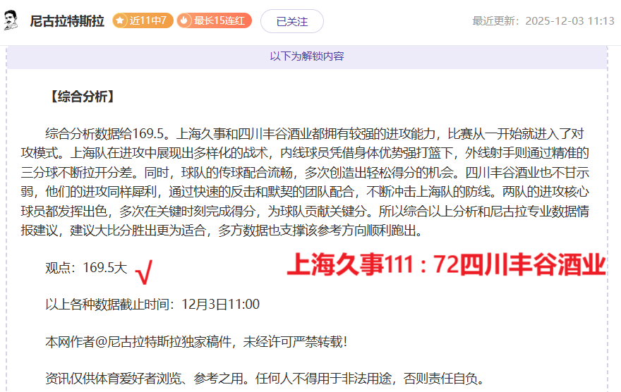 【成绩回顾】近11胜7,昨日CBA杯拿下二战胜利,信心赛事多项拿下连胜!尼古拉资深作者情报解读再有方法,信心强项情报解读连胜赛事再次出发,长期解读惊喜不断,此前作者创下4次双位数胜战绩,掌握着一手赛事资深情报,本期继续分享充满奇妙体育赛事,敬请大家持续关注!!