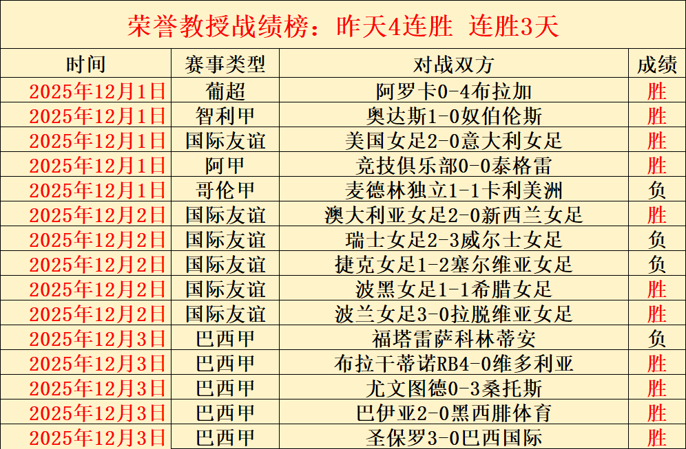 昨天继续胜,拿下4连胜,12月连胜3天!最高打下14连胜的表现已见证实力。今天继续奉上强项赛事系列,各线赛事都能保证清晰的解读思路与靠谱的选择方向!截至昨天荣誉教授已经有4330场解读经验,今天继续精选5场,多元化的赛事系列,以更高连胜胜利率绩迎接5000场记录来临,关注荣誉教授,成为荣誉教授的好伙伴!