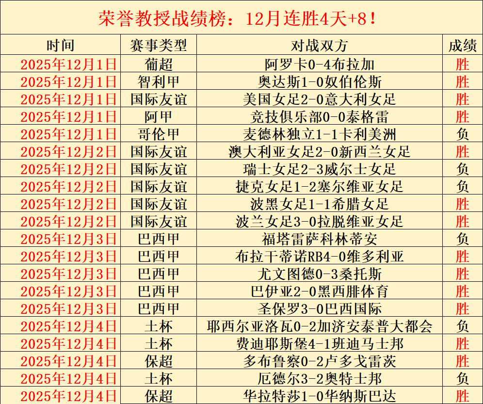 醒来又是胜利的节奏,12月连胜4天+8,战绩真实证明!最高打下14连胜的表现已见证实力。今天继续奉上强项赛事系列,各线赛事都能保证清晰的解读思路与靠谱的选择方向!截至昨天荣誉教授已经有4330场解读经验,今天继续精选5场,多元化的赛事系列,以更高连胜胜利率绩迎接5000场记录来临,关注荣誉教授,成为荣誉教授的好伙伴!