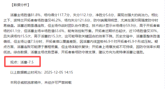 亚特兰大老鹰作为东部中游球队,赛季表现起伏不定。24场比赛中13胜11负,胜值54.2%,排名东部第9位。主场战绩平平,10场4胜6负,胜值40.0%,但客场表现强势,14场9胜5负,胜值64.3%,展现均衡实力。近10场比赛中,老鹰4胜6负,状态波动,包括近期3连败:负丹佛掘金1分、负洛杉矶快船23分、负底特律活塞1分,终结了之前的连胜势头。技术统计显示,老鹰投篮命中率48.3%和三分命中率37.1%略低于赛季均值,但助攻场均30.6次,高于奇才的25.4次,体现团队协作优势。防守端,场均失分116.5分,优于奇才的128.1分,但篮板场均41.6个,低于奇才的43.2个,内线可能存在劣势。疑点聚焦于:老鹰的客场统治力在连续作战中是否削弱?上场比赛负于奇才19分,是否反映疲劳或轻敌?历史交锋中老鹰对奇才近10场胜值50%,但让值胜值仅50%,暗示优势不明显。进攻效率能否弥补内线劣势?赛程密集是否导致体能下滑,影响关键球员发挥?老鹰1天前对阵掘金后背靠背作战,体能储备或受考验,近期状态下滑是否是暂时调整?技术统计对比,老鹰失误控制较好(场均14.1次),但客场防守效率下降,收官阶段强度存疑。