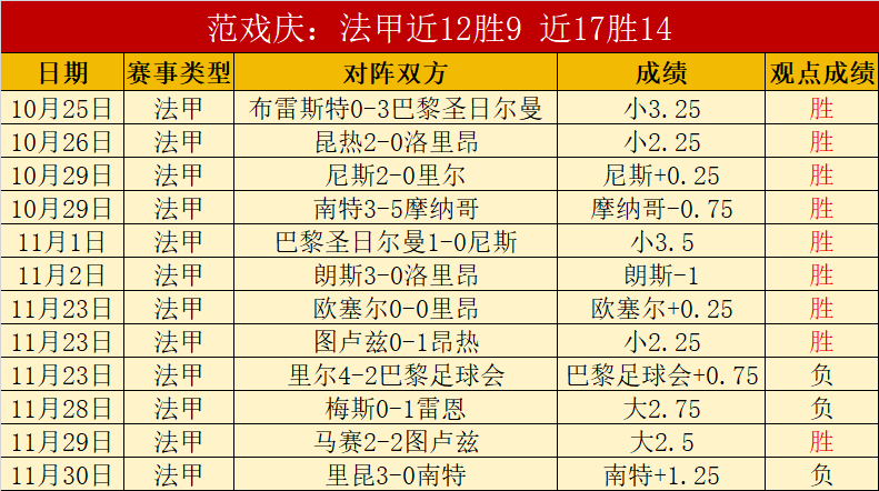 法甲17胜14,五大联赛近期表现出色。昨天4胜3,连续4天胜利20场13胜,胜+6。11月胜+33,10月10-31日合计胜+23,这样的胜+非常出色