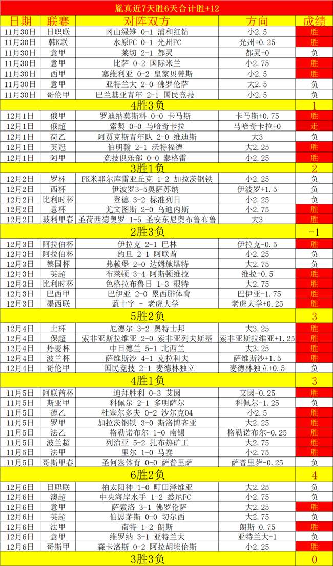 昨天平稳发挥,近4天胜+10,近7天胜6天胜+12。12月截止当前胜+12,11月胜+13,10月胜+12,月发挥非常出色