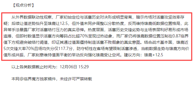 数据层面呈现异常波动,外界主流厂家初始主胜数值集中在1.28区间,但即时调整中主胜微降至1.27,客胜则从3.48升至3.67,与约文图特主场优势形成背离。亚让值从初开7.5分升至8.5分,数据位置反复震荡却未突破0.91临界值,这种非常规手法或存在放大约文图特体能隐患的意图。总分初盘以166.5-167.5分为基准,即时急升至169.5分,大比分数据位置虽从0.83降至0.80却始终未突破临界值,与两队近5次交锋场均产生2.8球的历史数据产生明显偏离。厂家对进攻效率的谨慎态度与约文图特近4战3次打出大比分的走势形成强烈反差,数据可信度存疑。这种多维度指标的矛盾波动,是否暗藏转移市场关注焦点的布局?