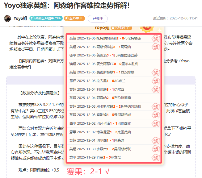 【上期回顾】:昨天私推德甲莱比锡6-0大胜,而公推热刺2-0完胜近7胜6!另外超级重点英超方案维拉2-1力克阿森纳,近9胜6的表现尚可!——今天核心赛事已确认,信心依旧,各位可点击一下【赞赏】按钮给予鼓励,轻松在“站内信”获取当天新鲜信心专场哦!多一份参考离喜悦再近一步,Yoyo将继续率粉粉们继续前行~