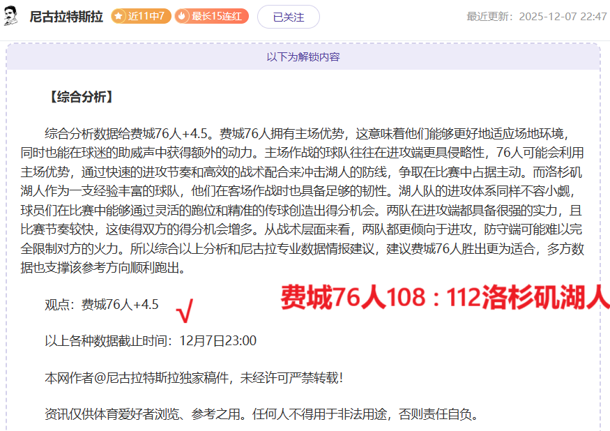 【成绩回顾】近11胜7,早场NBA拿下一胜,信心赛事多项拿下连胜!尼古拉资深作者情报解读再有方法,信心强项情报解读连胜赛事再次出发,长期解读惊喜不断,此前作者创下4次双位数胜战绩,掌握着一手赛事资深情报,本期继续分享充满奇妙体育赛事,敬请大家持续关注!!