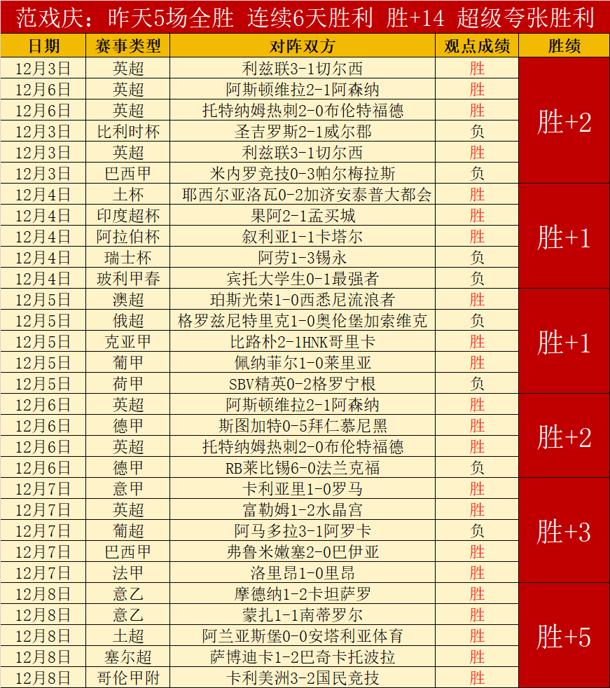 欧冠目前11胜9,今天优势赛事到来了。昨天5场全胜发挥,连取6天胜利合计胜+14,近期发挥非常精彩。11月胜+33,10月10-31日合计胜+23,长期保持精彩发挥