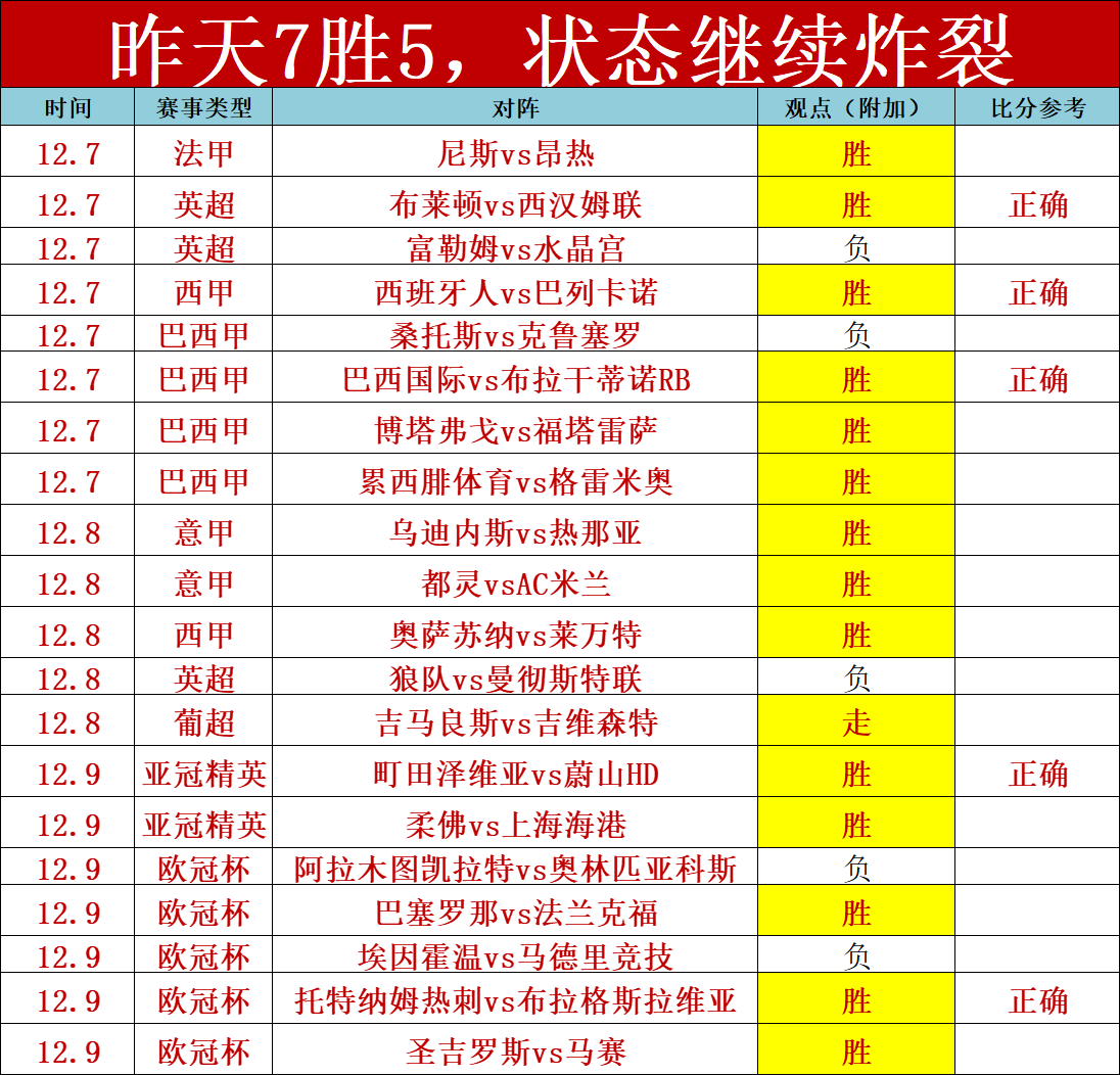 1、昨天继续炸裂,拿下7胜5的佳绩(包含公推),解锁贴拿下6胜5,亚冠精英2场大获全胜,欧冠杯也有出色的表现,今天乘胜追击。