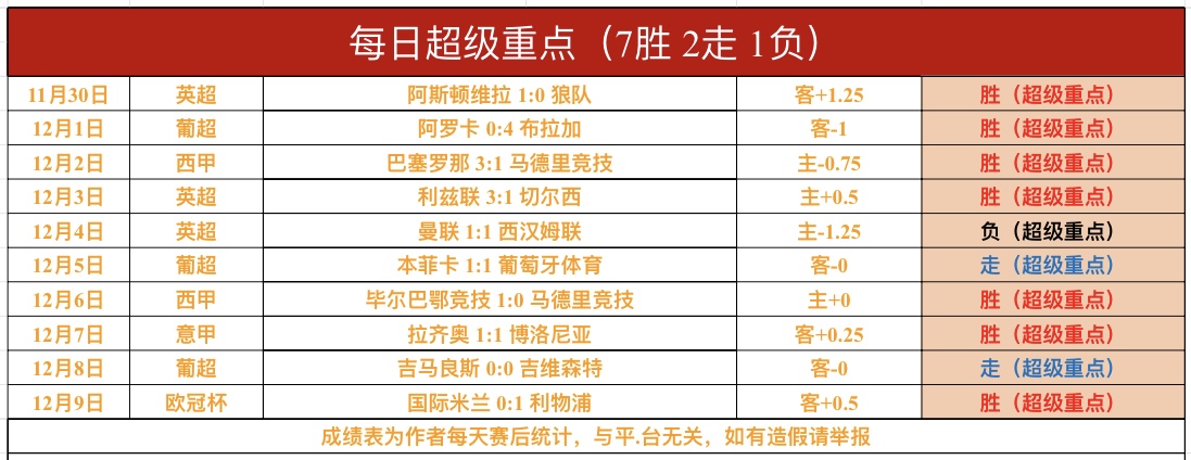 战绩回顾:昨日【超级重点】欧冠杯利物浦方向完美全胜,【超级重点】8胜7,成绩很出色!解锁文章3战拿到2胜1走1负,整体成绩不俗!鸡锅不追求场次多,追求少而精准,绝不滥竽充数,必须把老铁们的每一份信任都转化为胜利!