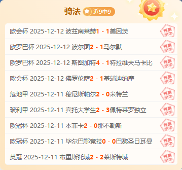 近9场推荐全中,状态正值巅峰!其战绩含金量极高,推荐列表中包含多场欧罗巴杯、欧会杯及欧冠焦点战,如精准命中波尔图、斯图加特、佛罗伦萨等队的赛果,对欧战赛事脉络把握精准。明日重点关注:欧罗巴杯及欧会杯的所有焦点对决。