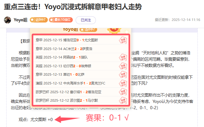 【上期回顾】:昨天私推暂停,公推意甲AC不胜很遗憾,但近14胜11表现不错!另外超级重点意甲方案尤文1-0拿下,豪取四连胜棒棒哒!——今天核心赛事已确认,信心依旧,各位可点击一下【赞赏】按钮给予鼓励,轻松在“站内信”获取当天新鲜信心专场哦!多一份参考离喜悦再近一步,Yoyo将继续率粉粉们继续前行~