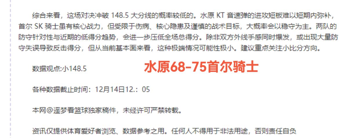 从战术风格来看,高阳近期进攻节奏明显加快,场均篮板和助攻数据均高于赛季平均,擅长通过二次进攻和转换进攻创造得分机会;而水原防守端的薄弱环节恰好能被高阳的进攻体系针对性打击,尤其是水原内线防守硬度不足,难以有效限制奈特的篮下强攻,这将迫使水原频繁收缩防守,给高阳的外线射手创造空位机会。水原在压力下大概率也会放开进攻。