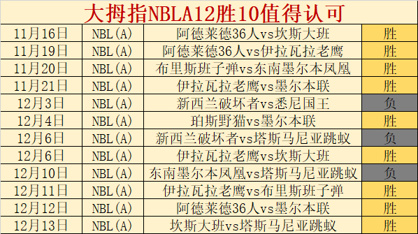 NBLA12胜10值得认可。昨天5场全胜,近11天胜9天,近53场胜34场,胜+15,状态很好,现在就是疯狂取胜时刻
