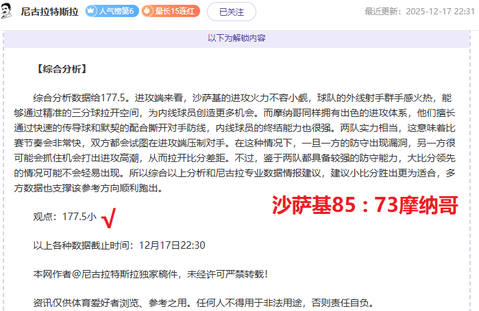 解锁内容包括:综合分析+比赛建议(数据观点+附加观点)