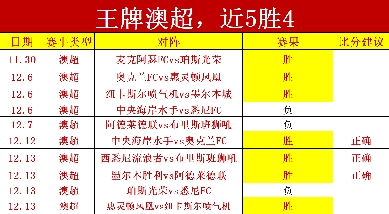 王牌澳超终于来了,上回两天就拿下5胜4的佳绩,并且命中3场比分,澳超已深耕多年,各队包括财政情况,阵容,还有未来的发展定位,笔者已经非常了解。