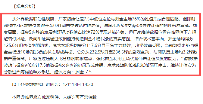 从数据层面观察,外界主流厂家初始让分值集中在6.5-8.5区间,但即时调整中多数厂家统一降至6.5,与骑士主场优势形成矛盾。总分值初盘普遍以240.5为基准,即时微调至239.5-240.5,未突破临界值,厂家对进攻效率的谨慎态度与两队近5次交锋场均产生3.2球的历史数据产生背离。胜负数值中,主胜初始平均值1.32,即时升至1.35,客胜从3.31降至3.17,但数据位置变化未同步反映市场热度,例如365数据让分值从7.5退至6.5,却未伴随大比分数值的显著波动,存在刻意制造骑士不稳的意图。这种多维度数据的异常波动,如厂家维持总分值稳定但调整胜负数值,是否暗藏诱导市场预期的布局?