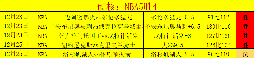 NBA目前5胜4同样精通和精彩度极高。昨天5胜4,前天5胜3,大前天5场全胜,大胜3天合计15胜12,非常优质的表现