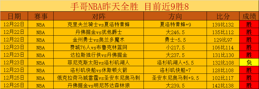 昨天5场全胜发挥,近4天拿下19场胜14场优质成绩,奉献胜+9。另外CBA和NBA目前表现非常出色,CBA5胜4,NBA9胜8,这两个赛事信心很好,非常值得信任。