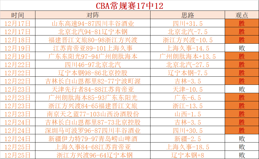 一、战绩回顾:昨天2场CBA没有拿下,CBA17中12。