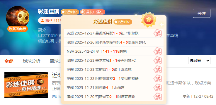 4.高胜率核心“彩迷佳琪” - 近8中7高效精准 - 自研模型见解独到!
