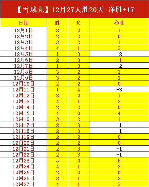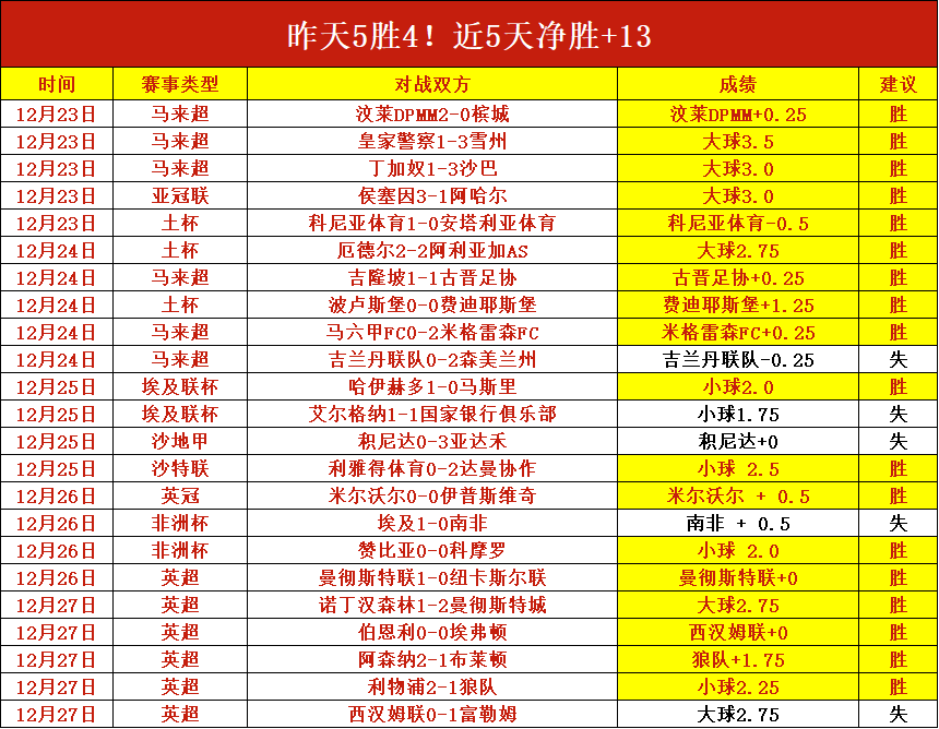 昨天5胜4,23号-27号近5天净胜+13,12月分享27天胜20天,净胜+17,长期稳定胜利值得信赖!今天赛事依旧选择强项系列,持续稳,别错过了!笔者近期前进脚步表现仍然优秀,本日赛程继续出击,争取在稳健的基础上进一步突破!