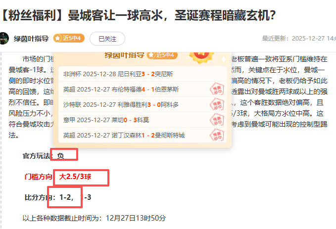 昨日5场顺利拿下4场!更是精准拿下森林1-2曼城+利雅得胜利3-0大胜两场一鱼三吃!!昨日又是一个4连红!叶指导独有的数据精准解读!12月咱们继续快乐!