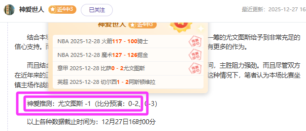 【作者前言:一名深耕足球篮球赛事领域的文字创作者,独创“数据+战术+心理”三维分析法,为粉丝提供独家前瞻内容。昨天重点的意甲尤文成功打出&NBA连续取胜,希望各位继续关注,福利多多!】