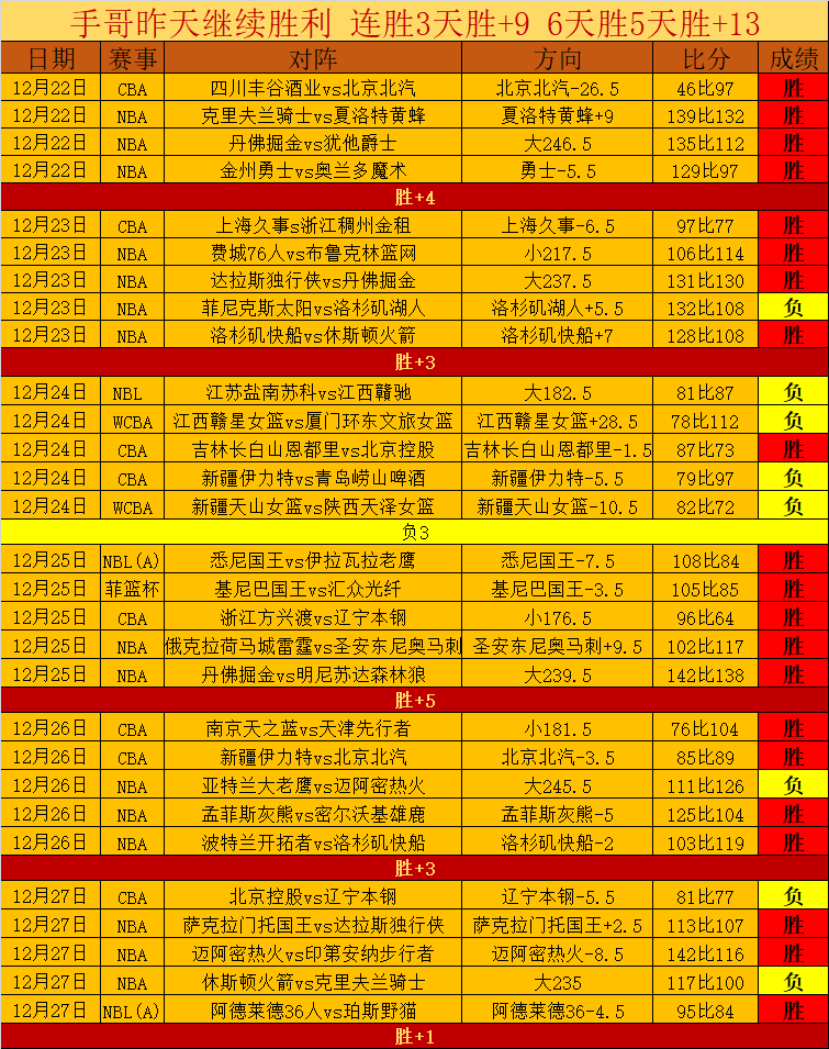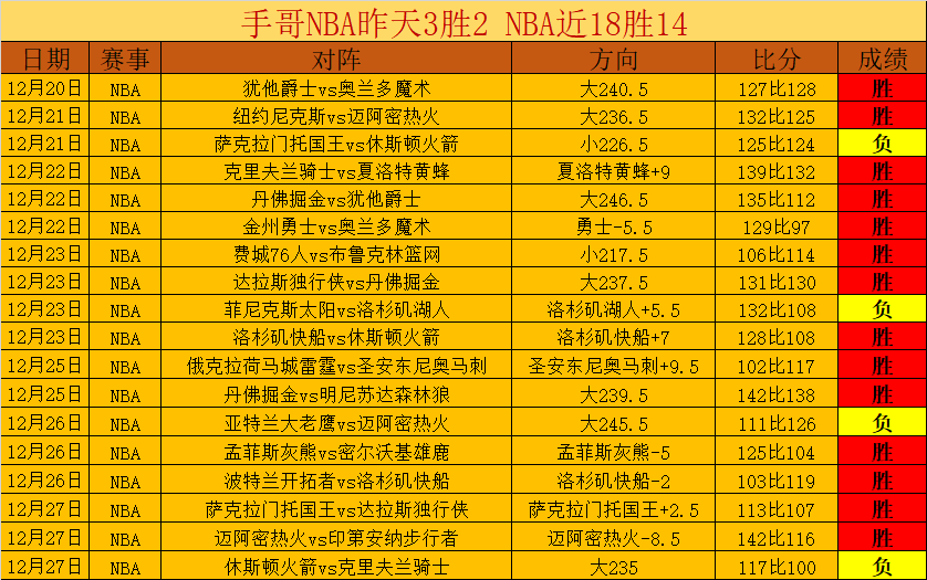 NBA昨天3胜2,近18胜14,非常出色的NBA精彩发挥。昨天继续胜利,连胜3天胜+9,6天胜5天胜+13,表现非常精彩