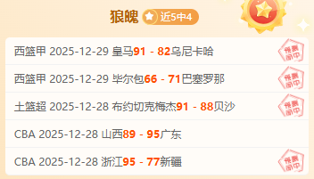 【成绩回顾】近5胜4,昨4场胜利,CBA、土篮超、二场西篮甲胜,新一期赛事继续关注赛事延续胜利,作为本网资深作者和篮球分析师实力有目共睹,擅长拆解数据用意,连胜佳绩历历在目,笔者将再接再厉争取得更佳战绩回馈粉丝,本场比赛将精选一场优质情报,敬请关注。