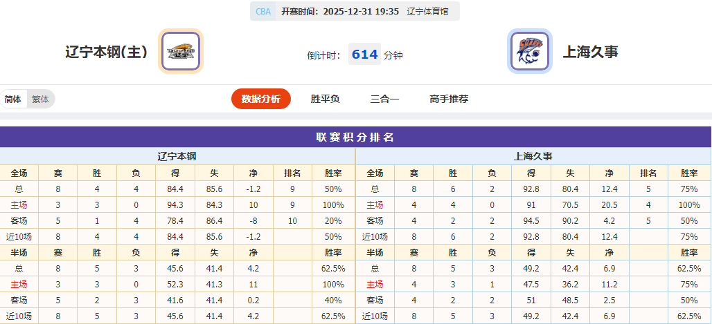竞彩标准与总分数据进一步印证这一倾向。标准方面,初指主胜最高3.40、最低2.10,客胜最低1.28、最高1.62,即时数据主胜普遍上调、客胜小幅上调,说明数据对辽宁主场取胜信心有所回升,但客胜仍维持在1.50以下的低区间,数据仍视上海为更稳妥的赛果选项。总分数据则相对稳定,各机构初指与即时均维持在174.5-175.5分,结合两队近期攻防节奏,辽宁近8场无一场得分破百、上海近4场3次打出小分,且辽宁主场场均总分178.6分、上海客场场均总分184.7分,均低于175.5分的数据阈值,总分走势更偏向小分,即两队合计得分难超175分。综合预测:客胜概率较高、总分小