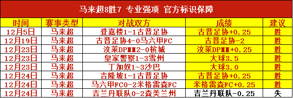 昨天4胜3,1月连续3天保持胜利脚步,12月净胜+15,马来超8胜7,标识保障。持续关注的粉丝有福了,长期稳定的胜利表现,当然值得信赖!别错过了,2026年更加美好,看好的朋友别犹豫!今天赛事依旧选择强项系列,笔者近期前进脚步表现仍然优秀,本日赛程继续出击,争取在稳健的基础上进一步突破!