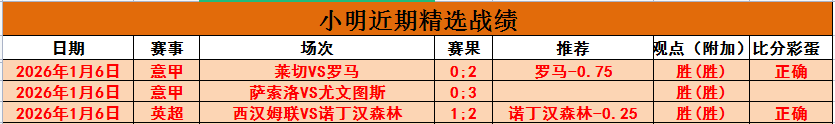 【上期回顾】收!收!收!昨整体5胜4,精选4胜3,罗马、尤文、诺丁汉全出,3连胜;赞赏1胜1,墨尔本城打出,赞赏15对12。昨双线大丰收,尤其拿下英超,这场比赛很难,但小明没有辜负大家期待,今继续冲!