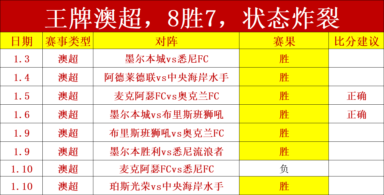 1、王牌澳超不负众望,近期打出8胜7的佳绩,另外私推1胜1负,私推近两天3胜2,今天继续乘胜追击。