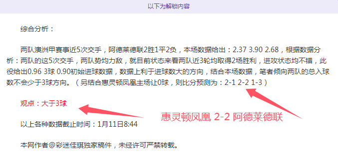 昨日澳超,惠灵顿凤凰2-2阿德莱德联,比分+观点正确;德甲,门兴格拉德巴赫4-0奥格斯堡,观点正确。
