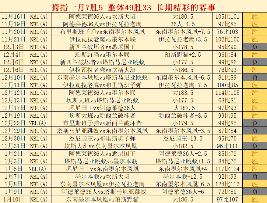 NBLA在一月拿下7胜5,近49胜33,长期精彩的赛事。昨天7胜6,前天5场全胜,昨天5场全胜发挥,近15胜13,近37天胜21天合计胜+21,非常惊人的胜+表现