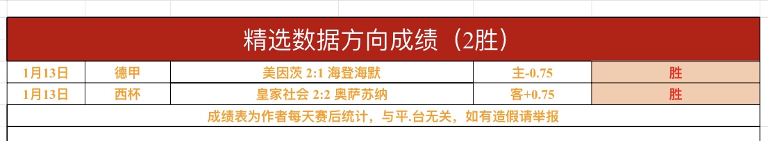 战绩回顾:昨日《精选数据方向》2战完美全胜,德甲美因茨、西杯奥萨苏纳很稳!【超级重点数据】1场英联杯曼城完美全胜,数据超级重点近4胜3!【超级重点总进球数】1场亚青U23日本大方向没有打出,超级重点总进球数近3胜2!《精选总进球数》1场没有打出!私推总进球数依然近4胜3!鸡锅不追求场次多,追求少而精准,绝不滥竽充数,必须把老铁们的每一份信任都转化为胜利!