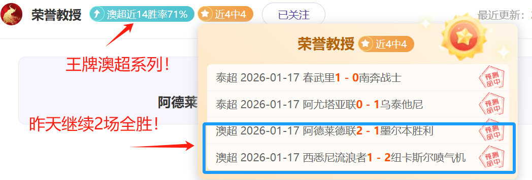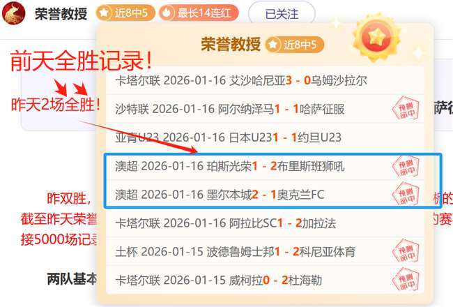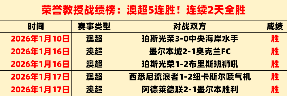 昨天4场全胜打出,澳超连续2天全胜表现,拿下5连胜,表现超级炸裂,最高打下14连胜的表现已见证实力。各线赛事都能保证清晰的解读思路与靠谱的选择方向!截至昨天荣誉教授已经有4550场解读经验,今天继续精选5场,多元化的赛事系列,以更高连胜胜利率绩迎接5000场记录来临,关注荣誉教授,成为荣誉教授的好伙伴!