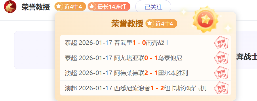 冲刺5连胜!昨天4场全胜打出,表现超级炸裂,最高打下14连胜的表现已见证实力。各线赛事都能保证清晰的解读思路与靠谱的选择方向!截至昨天荣誉教授已经有4550场解读经验,今天继续精选5场,多元化的赛事系列,以更高连胜胜利率绩迎接5000场记录来临,关注荣誉教授,成为荣誉教授的好伙伴!
