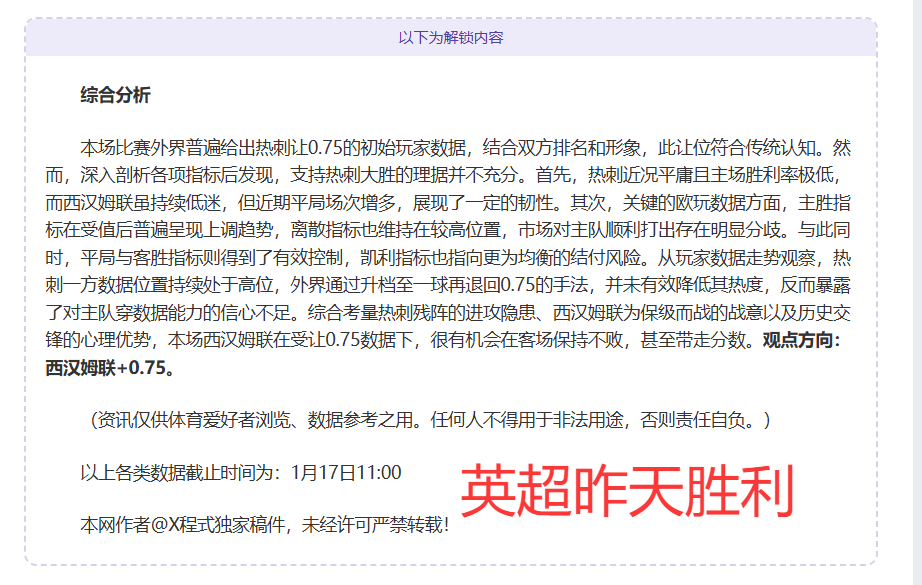 以下解锁内容包括:【综合数据分析、进球数分析、附加数据参考】