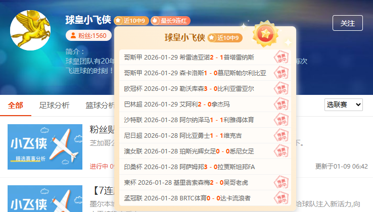“球皇小飞侠”是平台内公认的全能战士,其分析覆盖从欧冠到各大洲际联赛,展现了无死角的赛事理解能力。在拥有二十年积淀的团队支持下,他实现了质与量的双重爆发,近期打出近10场命中9场的恐怖效率,并曾创造9连红纪录。跟随他,意味着获得一个庞大专业智库的前沿洞察。