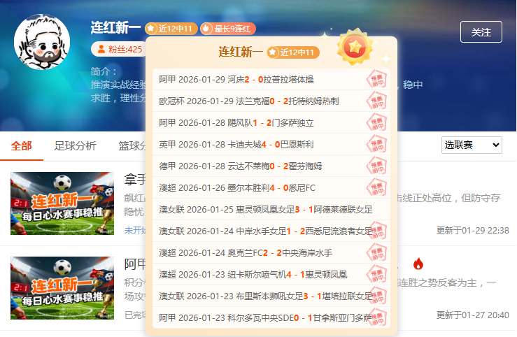 如果您在寻找当前平台状态最炙手可热的分析师,“连红新一”当之无愧。他将深度的实战推演与理性思维结合,正处在一个近乎完美的爆发周期:近12场推荐命中11场!如此高的命中率,是其“推演实战经验”方法论成功的极致体现,堪称当前的“命中率之王”。