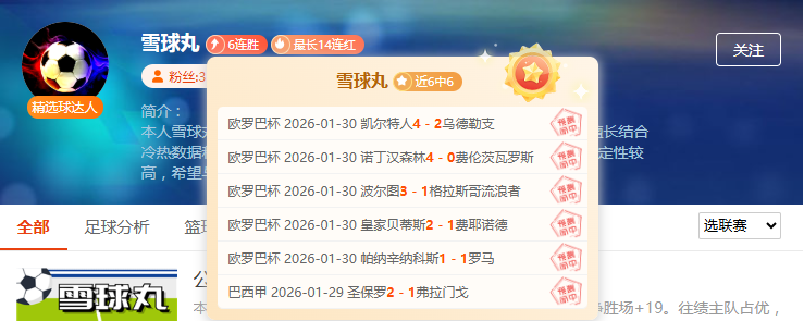 “雪球丸”是一位特立独行的数据科学家,专注于运用其独家的“冷热数据”模型来分析比赛。他不追逐热门,而是精于发现市场预期与实际价值之间的偏差。目前保持6连胜,并曾达成14连红的辉煌纪录,这证明其模型在捕捉市场错误定价方面的强大能力,是深度玩家的秘密武器。