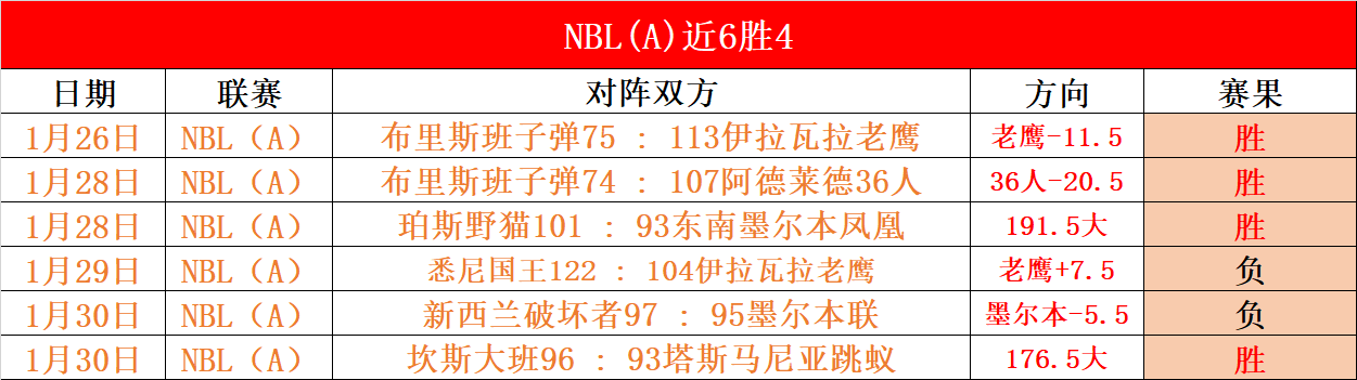 NBL近6战4胜 老鹰vs野猫NBL延续昨连胜解