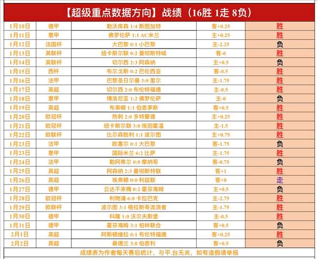 战绩回顾:昨日【超级重点总进球数】1场波兰超特马利卡完胜!私推{数据包周}1场西乙米兰德斯完美全胜,{数据包周}拿到连胜!【超级重点数据方向】1场没有打出,近24胜16!《精选数据方向》2战拿到1胜1负,西甲马洛卡胜利,意甲罗马没有打出,近44胜28!私推总进球数依然近4胜3!鸡锅不追求场次多,追求少而精准,绝不滥竽充数,必须把老铁们的每一份信任都转化为胜利!