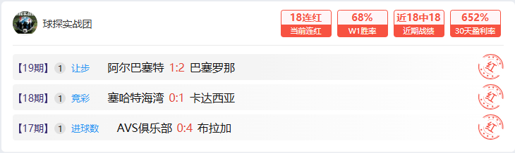 计划单板块的一众团队也是维持强势,其中临场决策租、球探实战团、红单工作室的连胜期数更是亮瞎了眼,而新晋的搅动欧陆风工作室也拿出了3连胜100%胜率来告诉大家。抱团专家更专业,值得信赖!