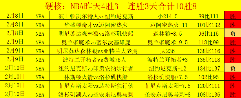 NBA昨天4胜3,连胜3天NBA合计10胜8,NBA表现十分精彩。昨天4胜3,连续三天胜利发挥,目前状态出色。